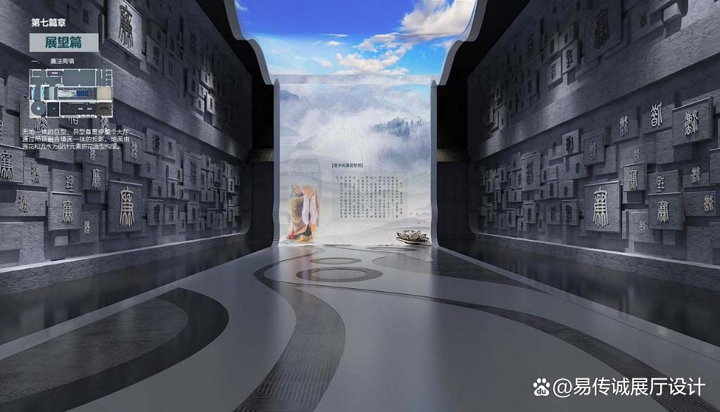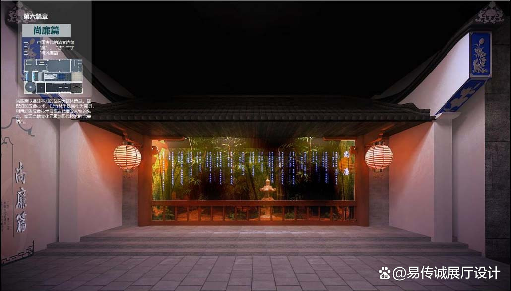 以福建本土瓦房为整体造型,以竹林半景作为背景。展现古代廉政人物的名言,实现当地文化元素与现代技术的完美技术。