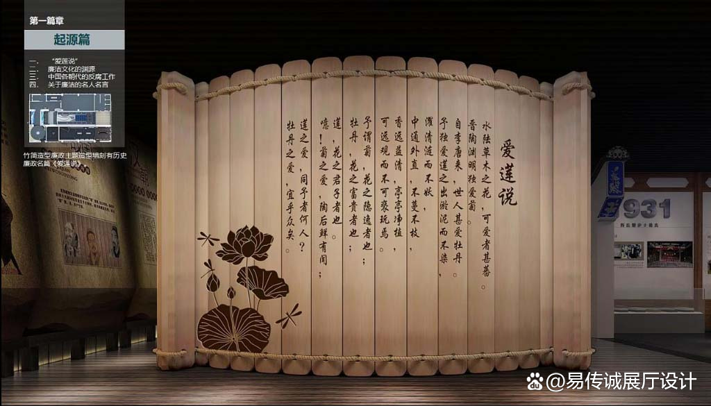 运用“岁寒三友”的竹筒造型呈现经典廉政名篇《爱莲说》,溯源中国廉洁文化传统,介绍历史廉洁人物故事。